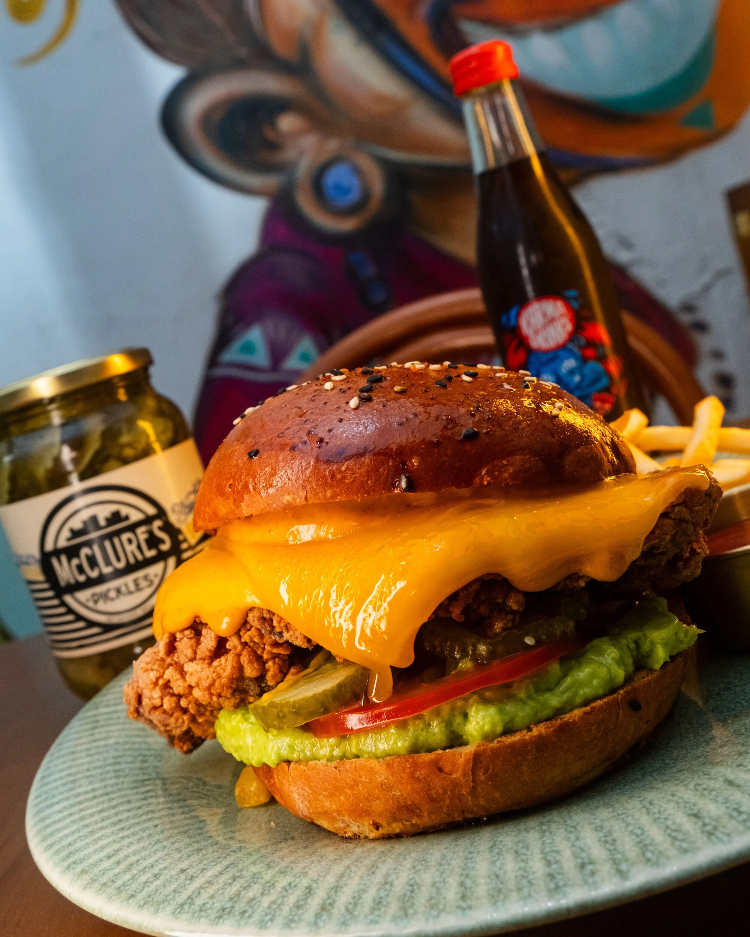 Golden Firebird 1.0: Crispy fried marinated chicken thigh stacked with smashed avocado, fresh tomatoes and lemongrass chilli sour cream in house-made demi brioche buns.